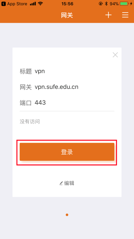 打开APP,点击【添加网关】,网关设置为:vpn.sufe.edu.cn,端口:443,用户名:使用上财认证账号与密码登录;