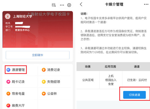 1、电子校园卡支持多承载平台使用,目前支持支付宝和云闪付,但用户同时只能有一个当前通道。