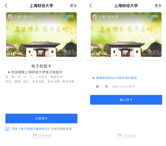 由于所有的用户身份信息在我校的认证系统及实名认证的支付宝中均有登记,支付宝和电子校园卡完全有能力对是否本人领卡与支付进行自动核实,请切勿尝试外借或者通过他人手机领取电子校园卡。否则,一旦发现,将永久封禁该用户的电子校园卡。另外我校已与蚂蚁金服展开全方位合作,对于该行为,将作为主要负面记录记入蚂蚁信用。