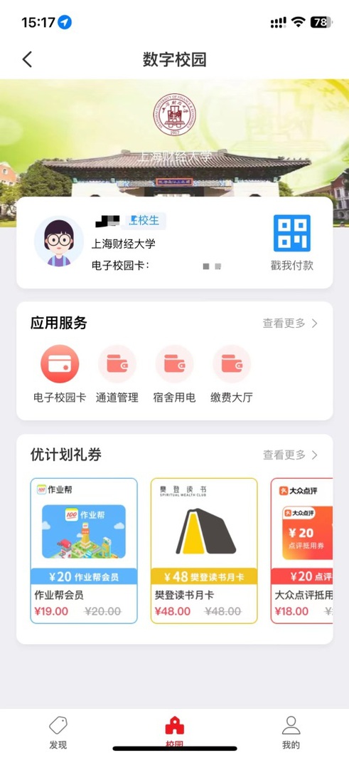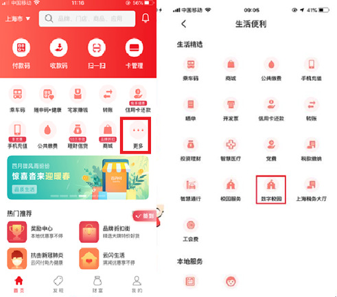 如需在云闪付APP里查看电子校园卡信息,请依次点击首页菜单-->更多-->生活精选栏目下的数字校园: