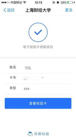 3、身份验证通过后,提示领卡成功,然后您就可以通过点击查看电子校园卡,来查看自己的校园卡。您领取成功后,即可到指定场景使用。领取后的电子校园卡可在“支付宝”-“我的卡包”中查看并使用。