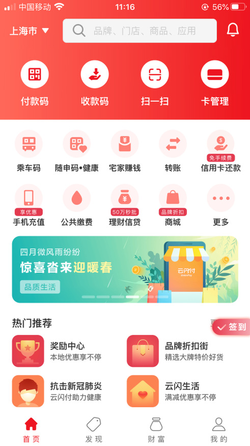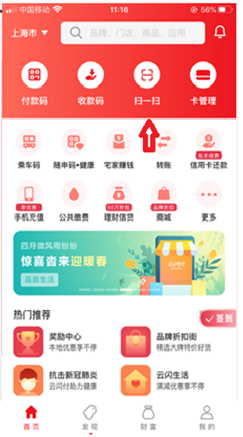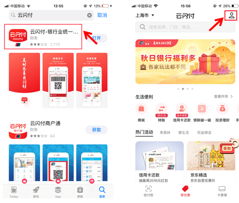 1、下载安装“云闪付”APP,成功安装后打开应用。账号登录(如无账号,首先进行新用户注册)。(若已使用过“云闪付”APP,可跳过步骤1、2,直接操作步骤3)