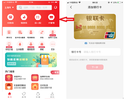 2、点击首页菜单栏“卡管理”,点击+,添加银行卡(卡号为62开头的银行卡),并开通支付功能。